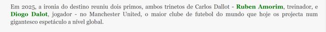 英国《太阳报》报道也说,曼联内部人士证实,阿莫林与达洛确实存在亲戚关系。据其报道,卡洛斯·达洛特出生于法国,他与兄弟姐妹何塞与朱莉娅一起在欧洲各地巡演,最终定居在葡萄牙,在布拉加继续自己的表演事业。
